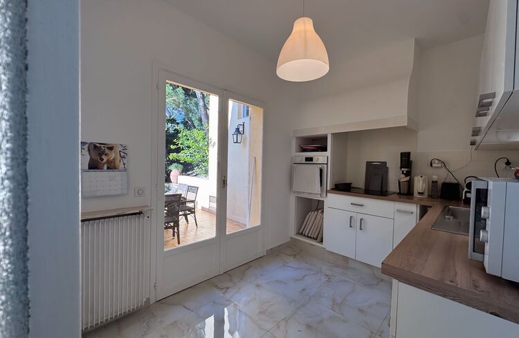 Un séjour chaleureux avec cheminée, s’ouvrant sur une grande terrasse couverte avec une vue mer spectaculaire. Une cuisine indépendante entièrement équipée donne sur une terrasse ombragée, parfaite pour des repas en extérieur. L’étage abrite également une grande chambre, une salle de bains et des toilettes indépendantes. -